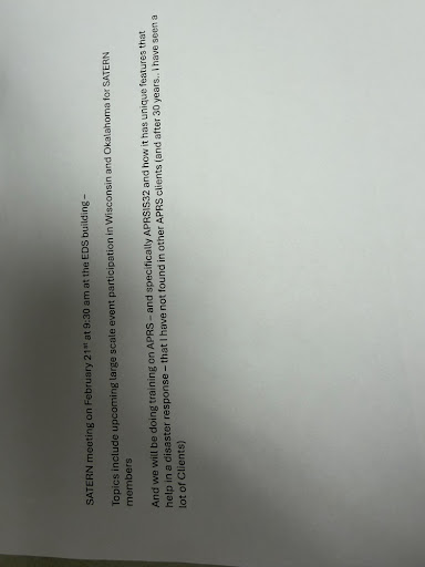 Topics include upcoming large scale event participation in Wisconsin and Oklahoma for SATERN members